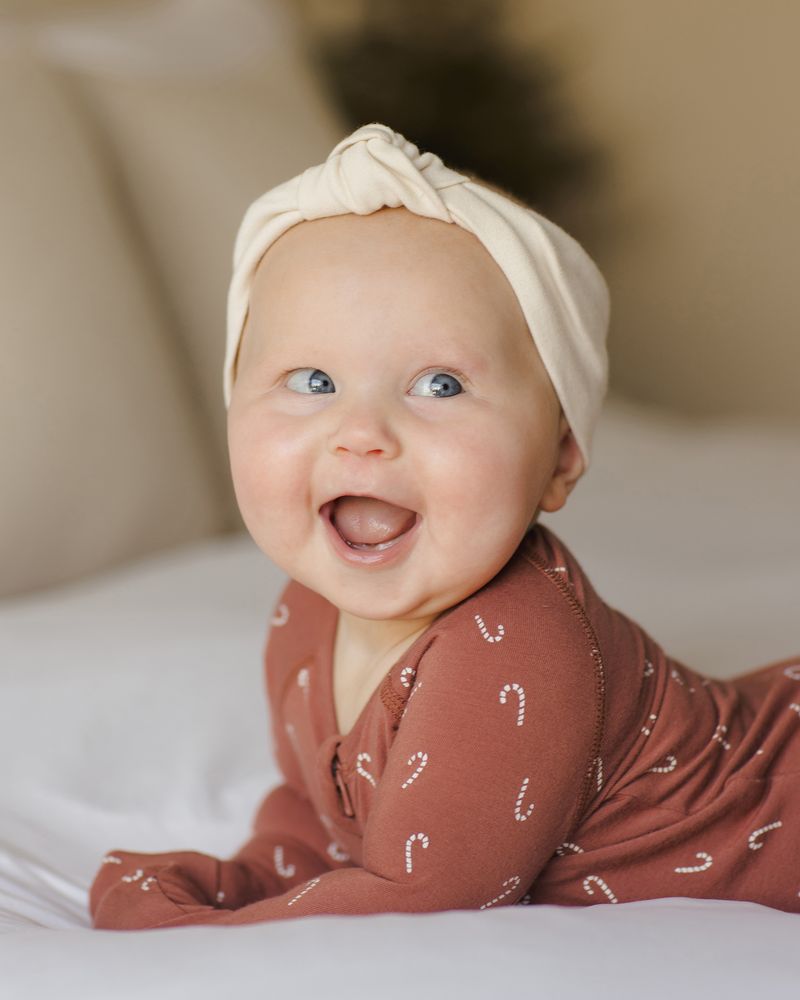 Full double-zip footie crafted from our soft and stretchy bamboo fabric. Fold-over hand mitts included on sizes NB – 3-6M. Raised screen print on soles of size 6-12M for added traction.
