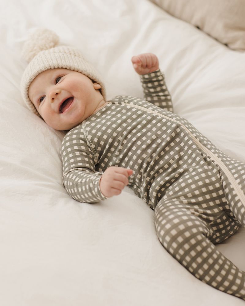 Full double-zip footie crafted from our soft and stretchy bamboo fabric. Fold-over hand mitts included on sizes NB – 3-6M. Raised screen print on soles of size 6-12M for added traction.