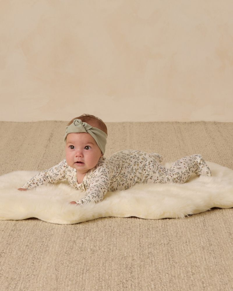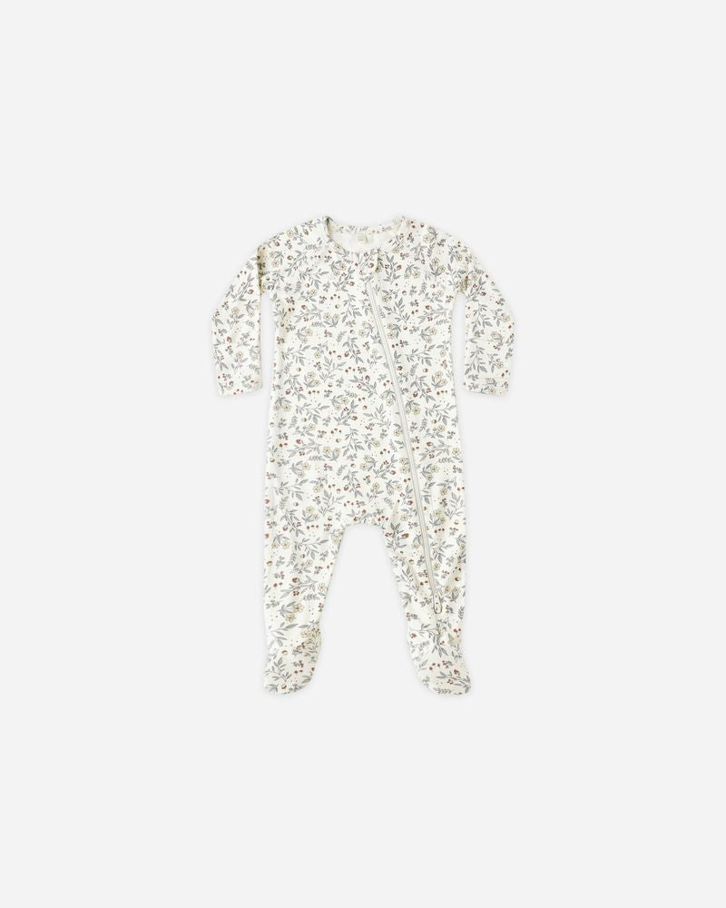 Full double-zip footie crafted from our soft and stretchy bamboo fabric. Fold-over hand mitts included on sizes NB – 3-6M. Raised screen print on soles of size 6-12M for added traction.