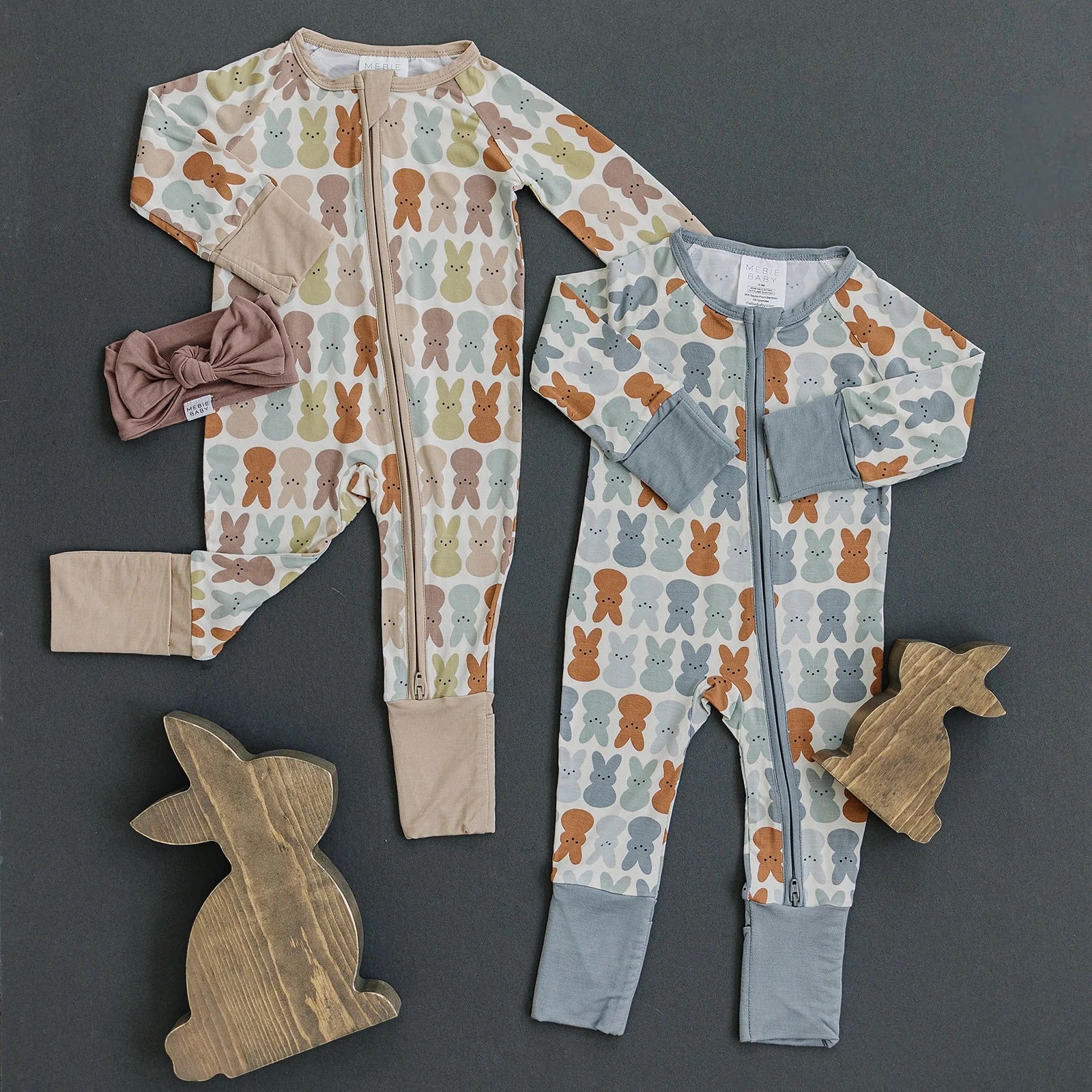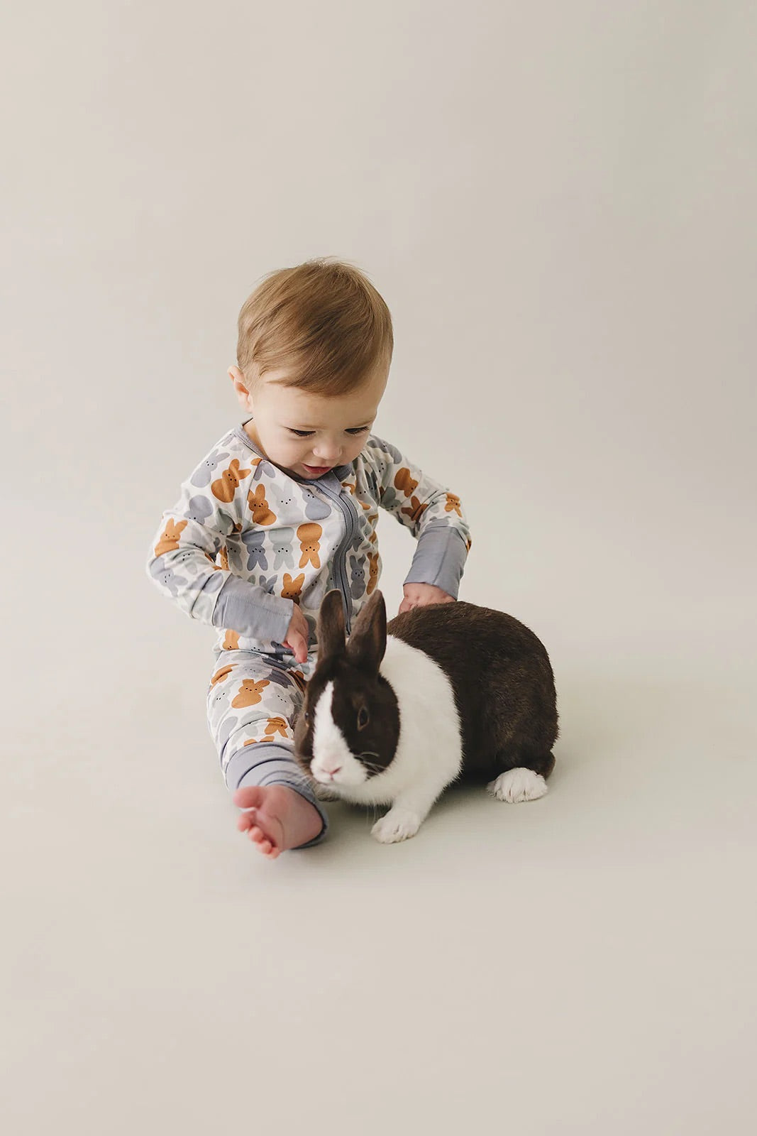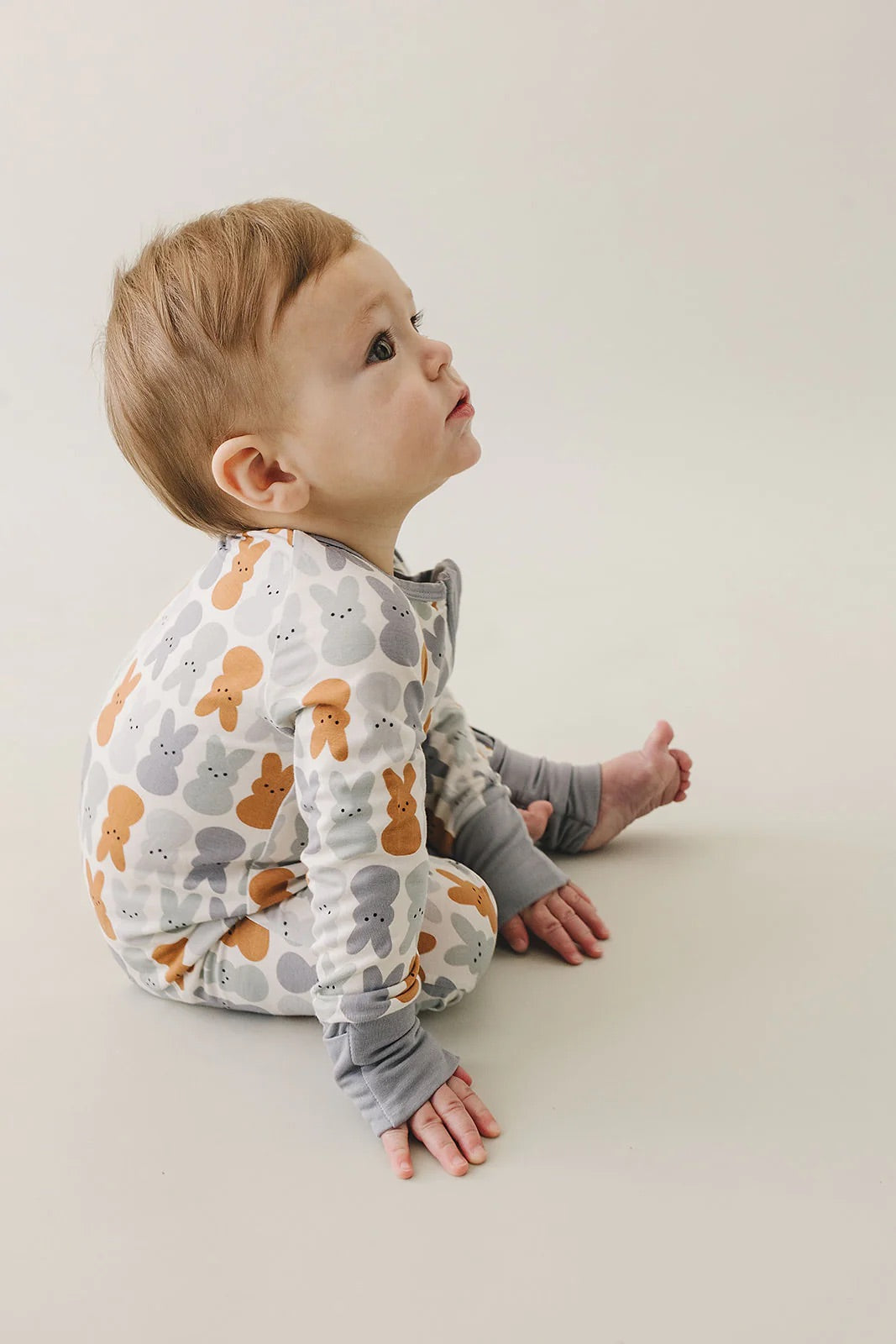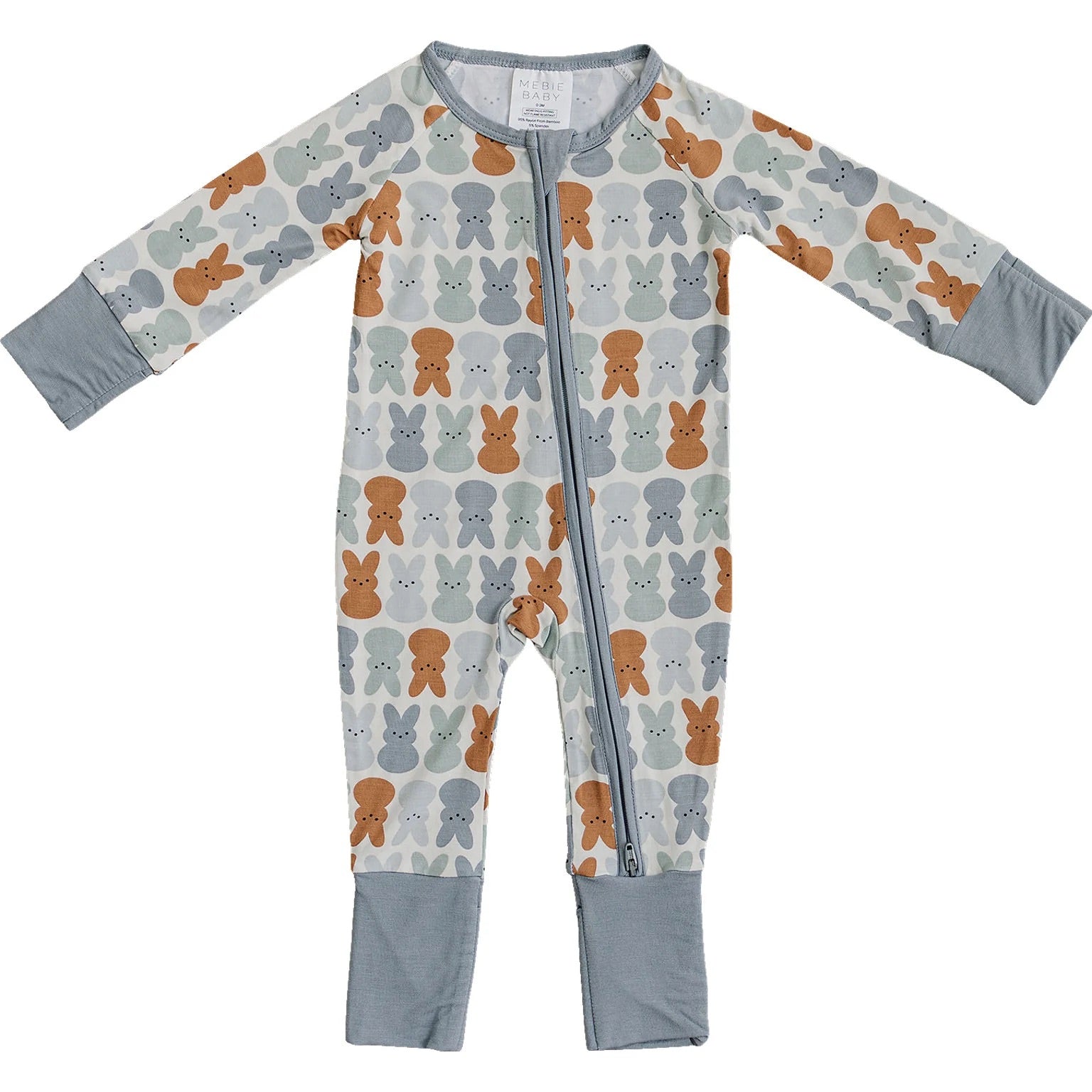These are our printed bamboo footed baby pajamas. They are made out of a soft bamboo fabric and are done up with a zipper. This features a double zipper that zips from the top and bottom meant for easy diaper changes. The functionality of these zippers make them a baby essential. We added foot cuffs so when you remove them it adds to the length, making these fit your child for longer. This print is so classic, they are the perfect Easter pajamas!