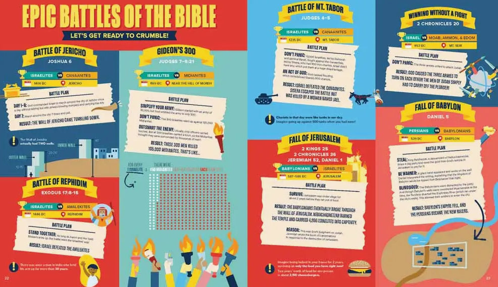 Boring vs. the Bible? No contest! Ding, ding, ding! Ladies and gentlemen, welcome to "Bible Infographics for Kids Vol. 2," where we're going to compare some of the most AWESOME opposites from God's Word and witness amazingly EPIC battles between good and evil. See these fierce foes square off in the infographic octagon: -Light vs. Darkness—and why you'll never see them in the same place -Angels vs. Demons—both are powerful, but only one side will win in the end -Feats of God vs. Failures of Men—God did incredible things. Men? Not so much. -False gods vs. the One True God—separating the many pretenders from the only real contender. -Heaven vs Hell—hell is no joke. But neither is heaven. It will be seriously mind-blowing! And yes, we're going to explore more fun and quirky facts from God's Word and gain a bunch of Bible knowledge along the way. That's what infographics do. They make the most exciting book in the world come alive.