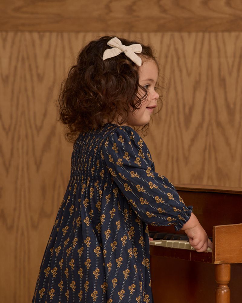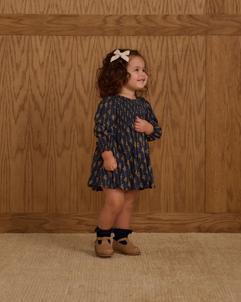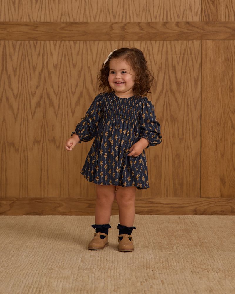 Our long sleeve Capri Dress features a darling smocked bodice and a flowy skirt. Coordinating bloomers included with sizes 0-3M - 18-24M.