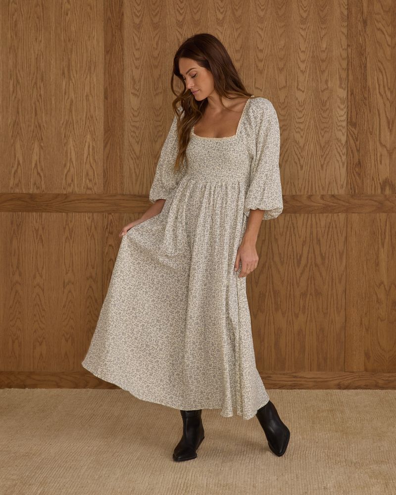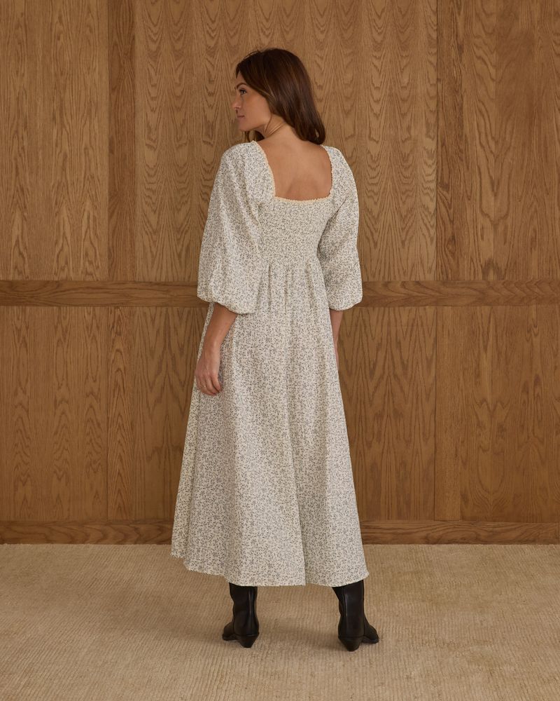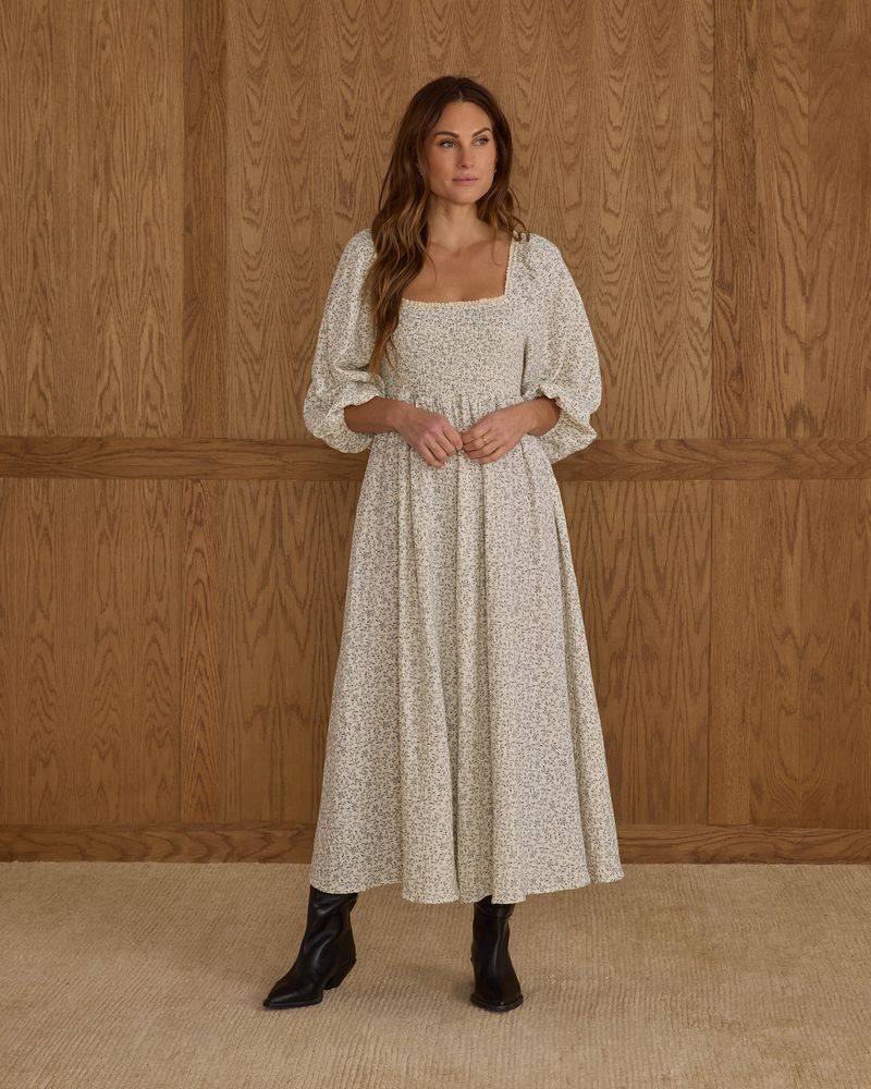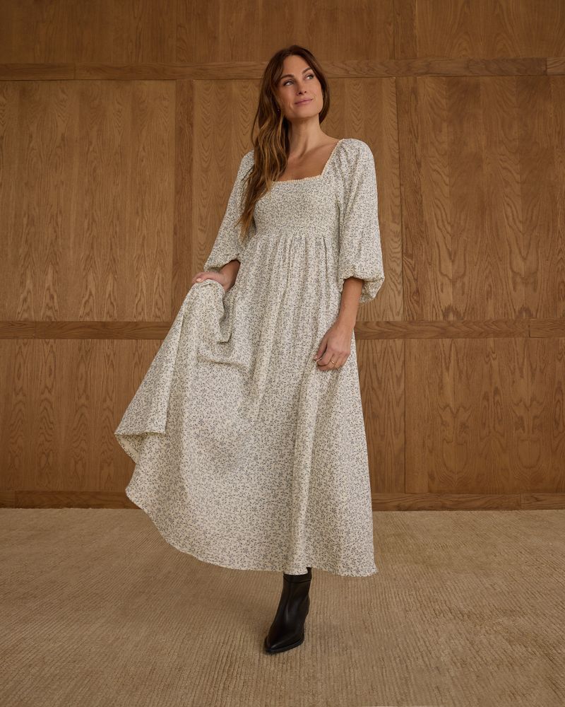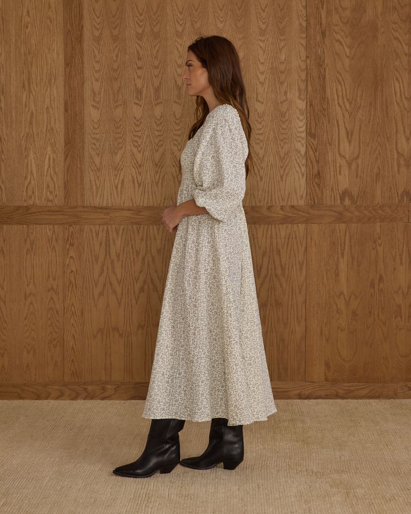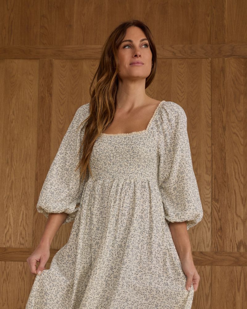 Our Della Dress features a smocked bodice and mid-length sleeves, beautifully accented with intricate crochet trim along the neckline.