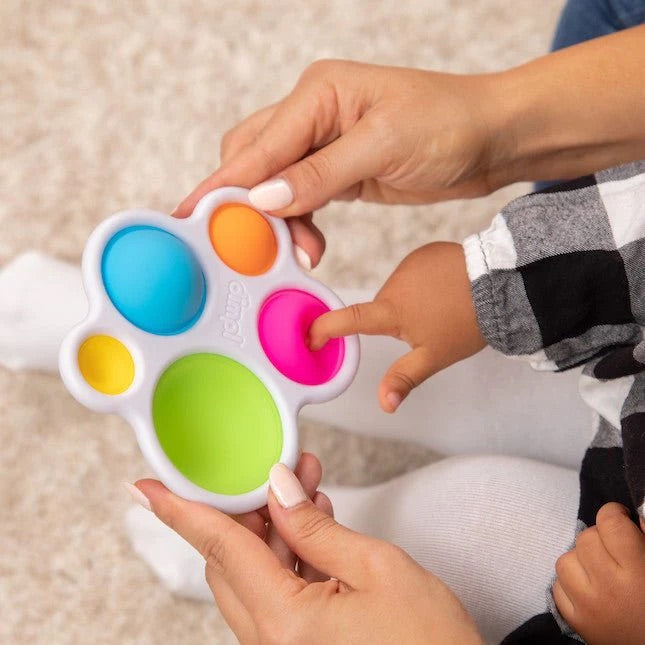 Characteristics: Fat Brain Toys Suction Dimpl encourages fine motor skills, sensory exploration, and cause-effect learning. It features five vibrant silicone bubbles in varying sizes and colors in an ABS plastic frame.