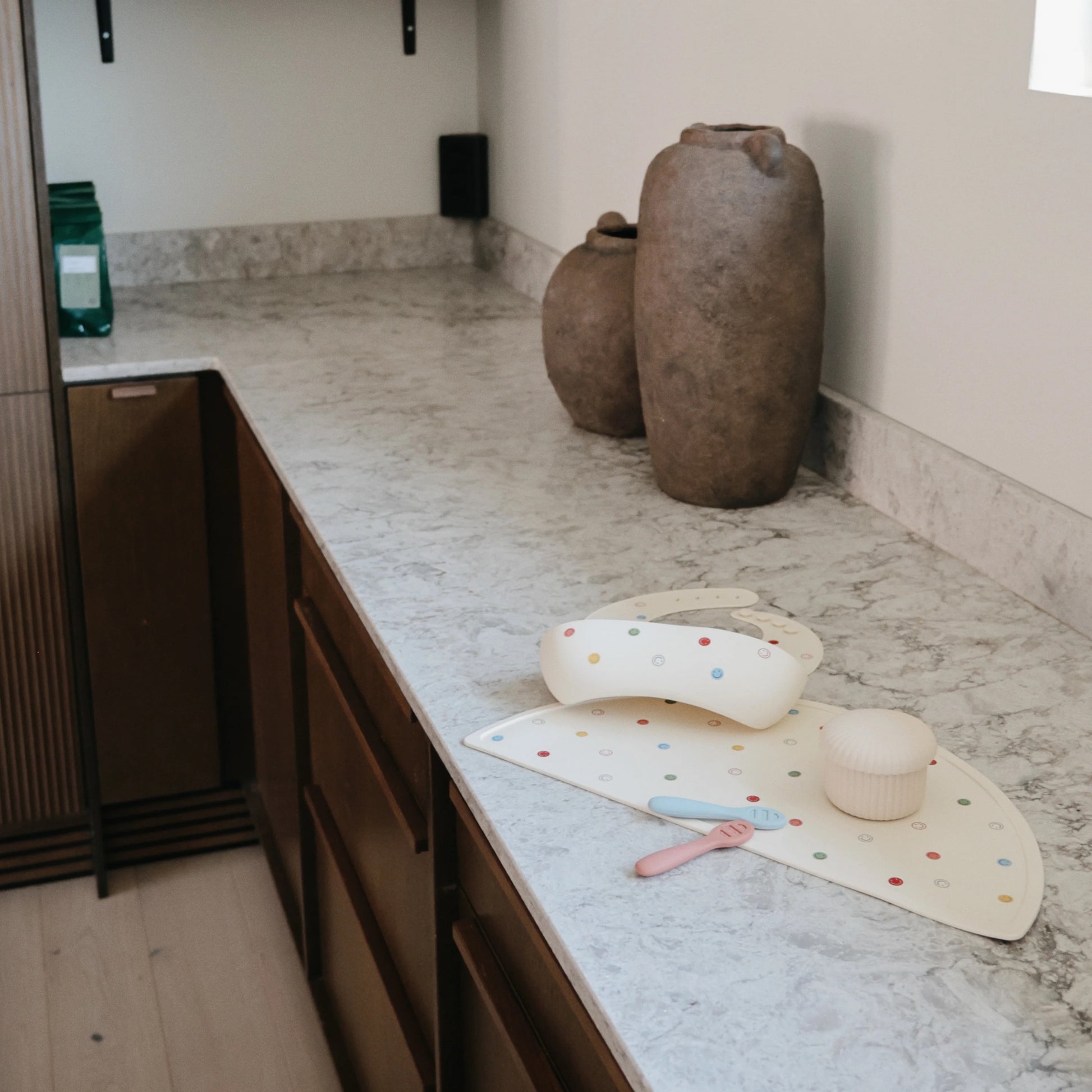 Our First Feeding Baby Spoons are designed to make your little one's transition to self-feeding smoother. Stage 1 has a solid surface without holes, ideal for thin purees and yogurts. When babies are ready for heartier textures, they can transition to Stage 2 with open slots for scooping thicker foods like oatmeal and mashed potatoes. Both versions include sensory dots on each side, providing a soothing experience for teething gums. The flat design ensures there's no wrong way to pick up the spoons, making it easy for little hands to manipulate without requiring wrist rotation.