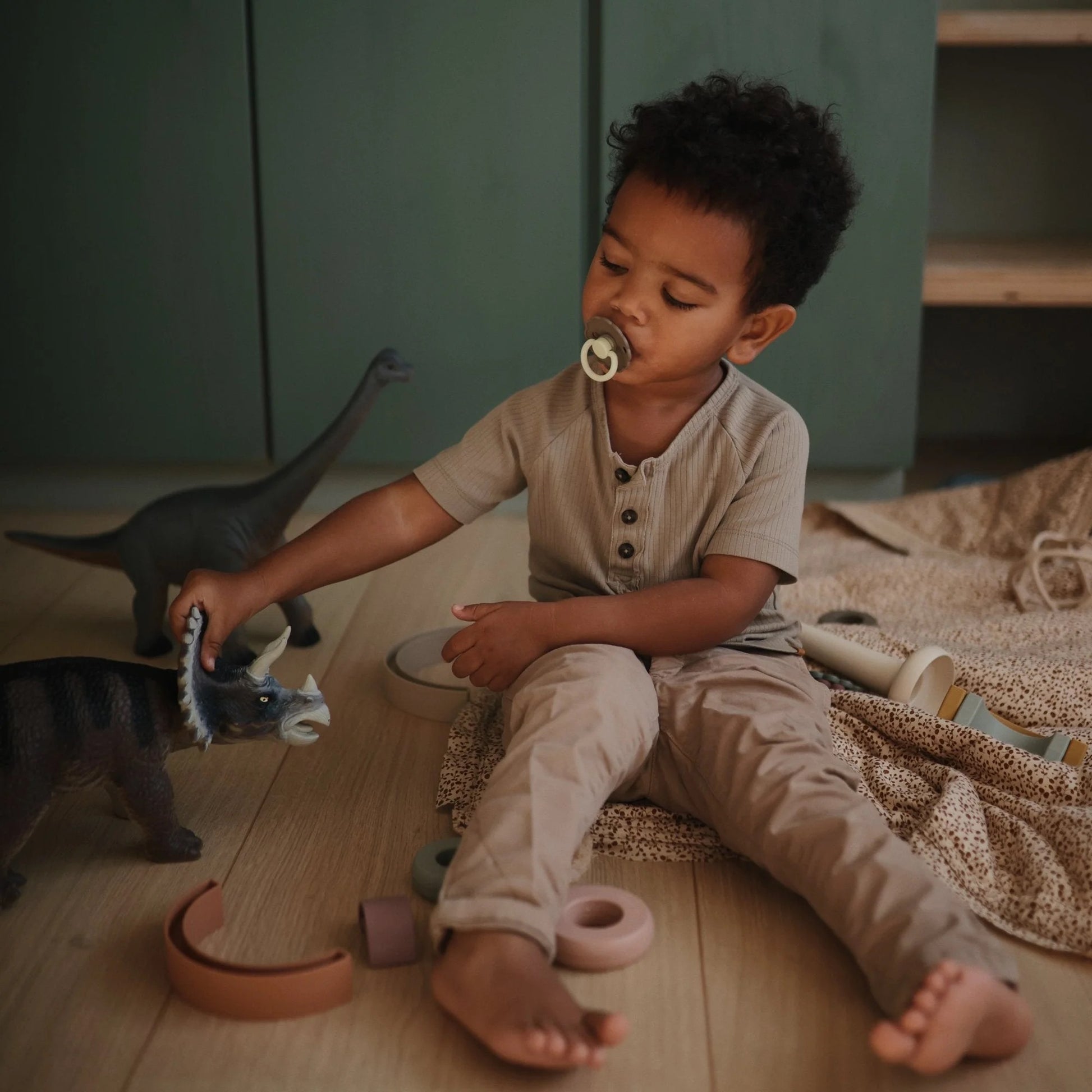 The FRIGG line of night rubber pacifiers is thoughtfully designed for your baby's comfort with sections that glow in dark settings. The outward curve keeps the pacifier off their delicate skin, while features like air holes and a security handle ensure your baby stays safe. Available in a range of soft colors, FRIGG pacifiers make a beautiful addition to your collection of baby essentials.