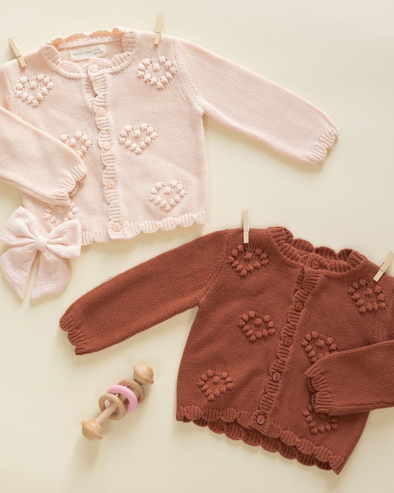 Our Knit Cardigan in it's love era with a lovely heart bobble knit, scalloped trim, and faux shell buttons for an extra sweet look.