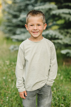 A timeless essential for everyday comfort. Our Sage Long Sleeve Cotton Tee is made from breathable cotton, offering a soft, lightweight feel with a classic fit that’s perfect for layering or wearing on its own. Perfect for school days, play dates, or cozying up at home.