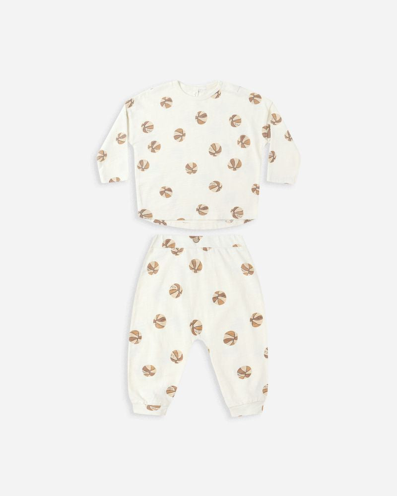 This comfortable cotton jersey set includes a relaxed long sleeve crewneck tee and dropped-crotch slouch pants. Shoulder snaps included on sizes 0–3M - 6–12M for easy changes.