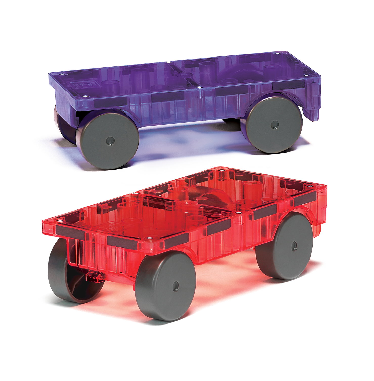Maginations are off to the races with MAGNA-TILES® Cars! Build cars, trucks, trains and more! The Cars 2-Piece Set comes with a pair of wheeled, magnetic chassis to build upon, promoting hours of open-ended play for children ages 3+. Now available in a rainbow of colors!