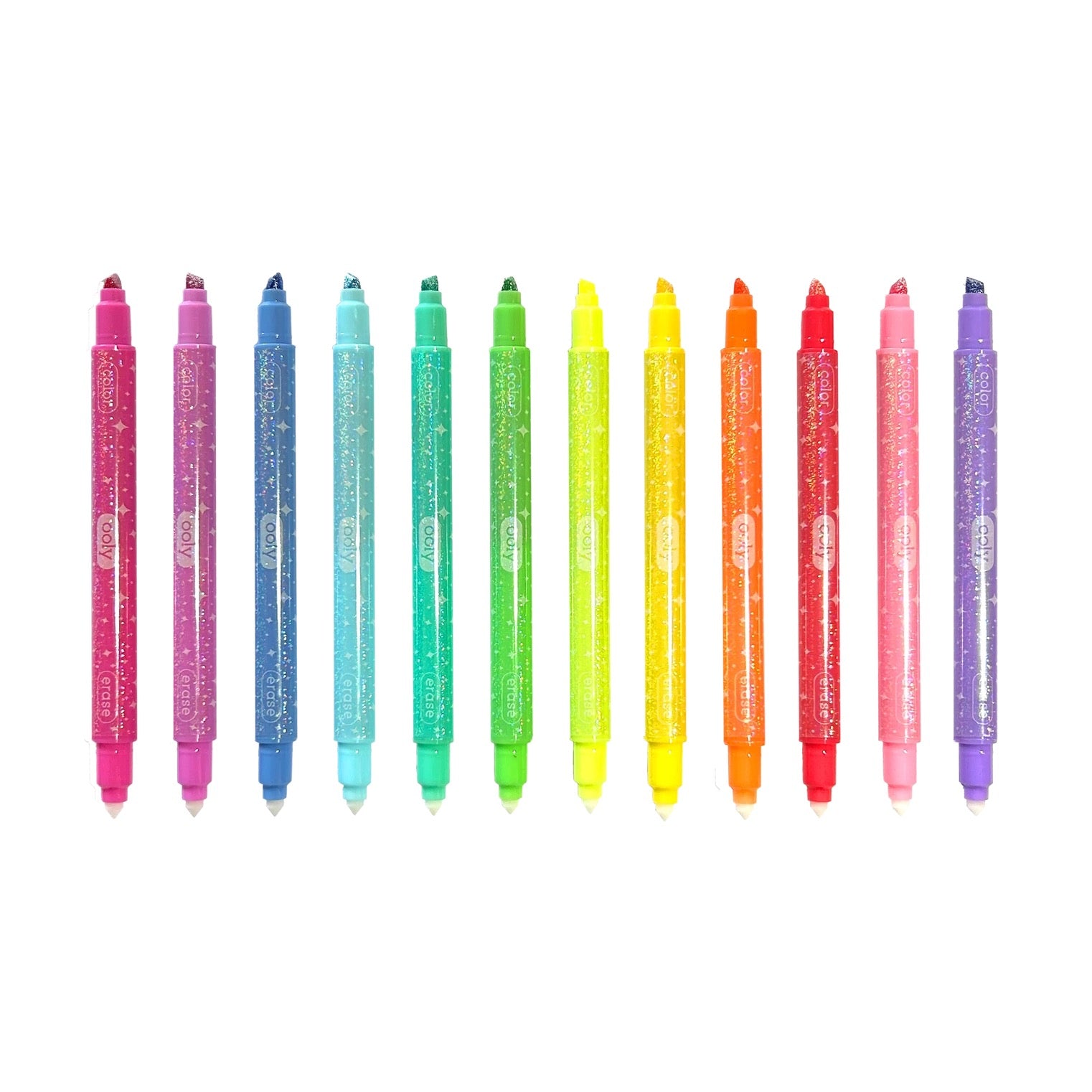 Sparkle, create, and erase with the Make No Mistake! Glittery Erasable Markers! This set of 12 glitter markers lets you add dazzling color to your artwork, notes, and doodles—then fix any mistakes with ease. Each erasable marker features a glittery ink on one end and a magic eraser tip on the other, so you can easily correct, refine your designs, and create negative space in your colorful creations.