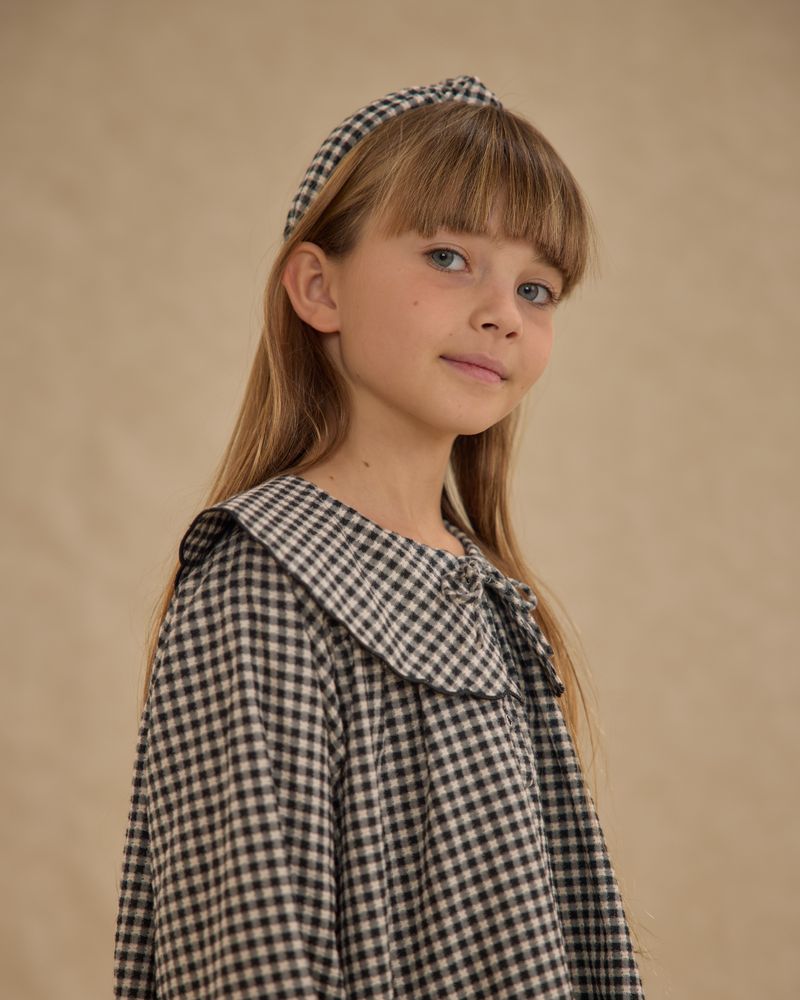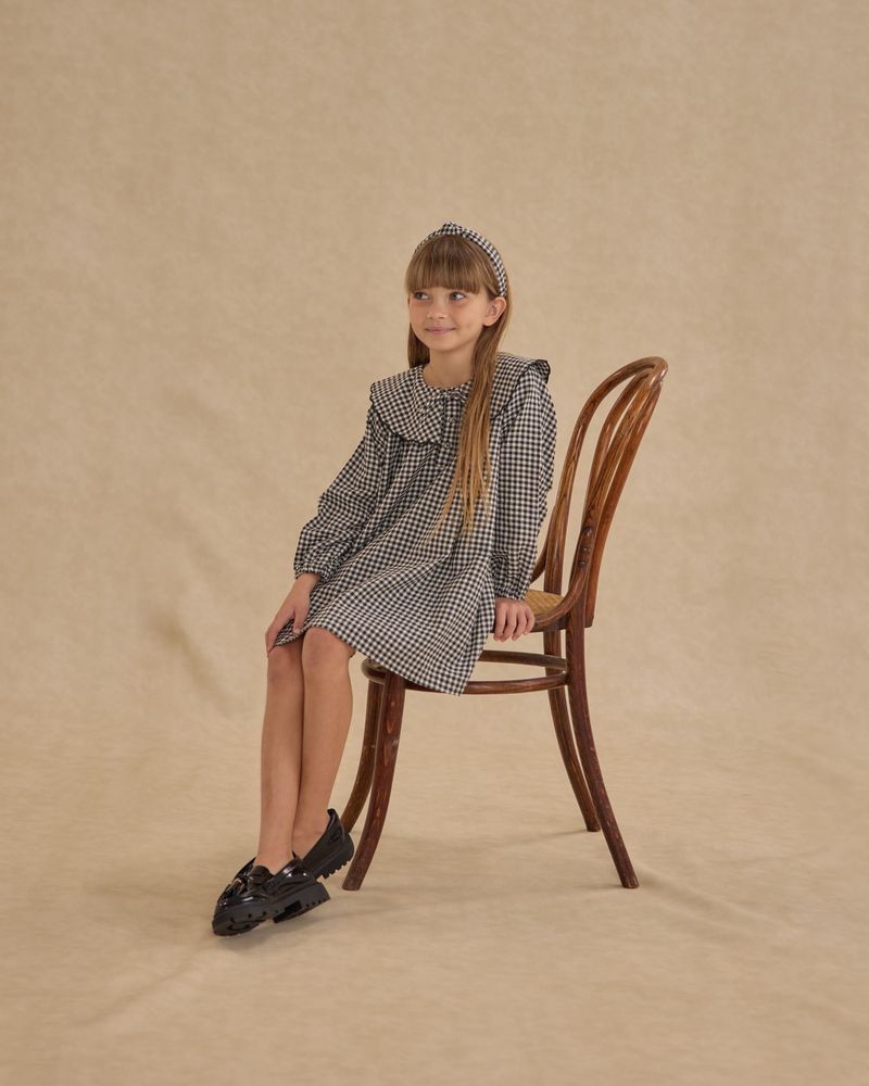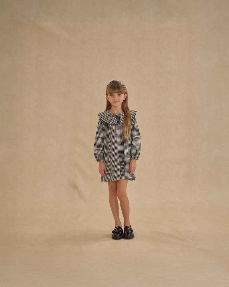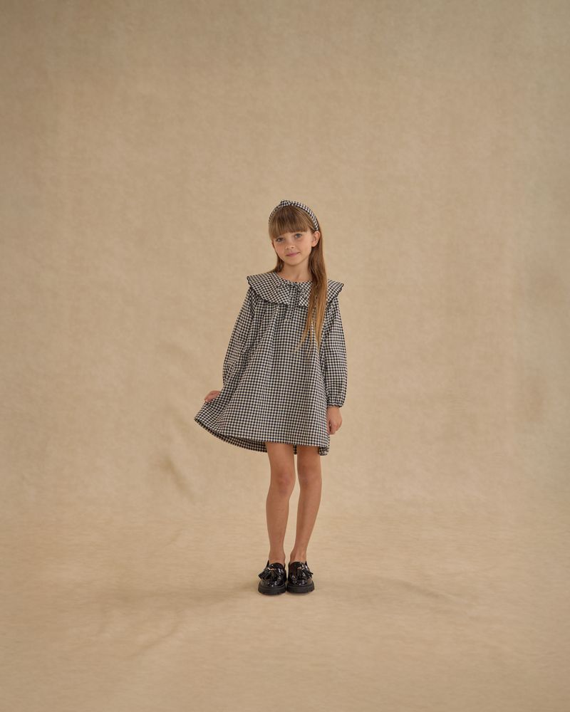 Our Mini Dress features a charming oversized collar with merrowed scalloped edges, balloon sleeves, and a front button placket with a fixed bow for a sweet finish.