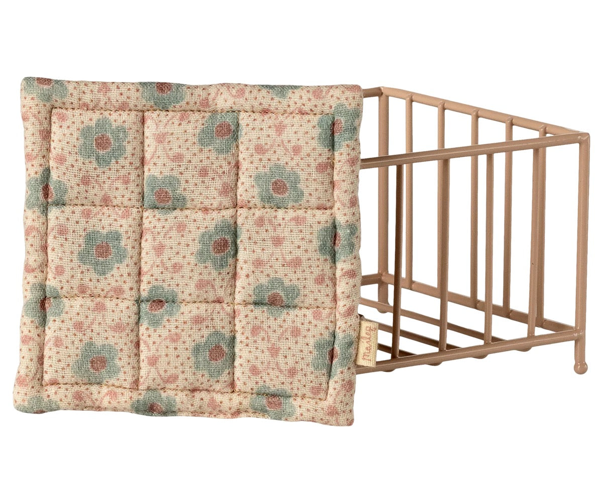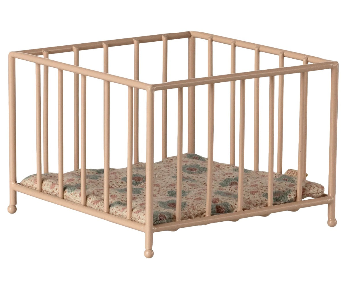 Keep your baby safe in a sweet playpen. This size fits all friends in size My and baby mouse perfectly. The playpen is in metal and painted in a rose tone. In the bottom is a soft mattress covered with unique Maileg fabric.