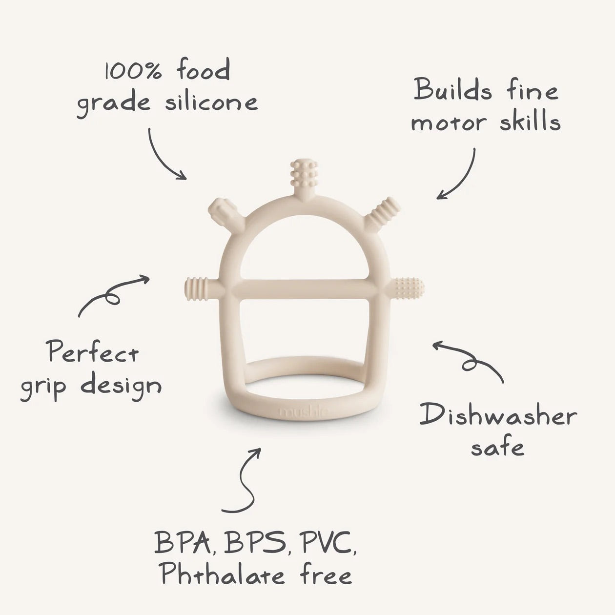 Our no-drop sensory teether will engage your little one’s senses as they discover self-soothing techniques. Made from 100% non-toxic, food grade silicone, this teether is safe for chewing as babies seek relief for sore gums. With an easy-to-grip interior handle, littles can improve fine motor skills while exploring the soothing textured surfaces-