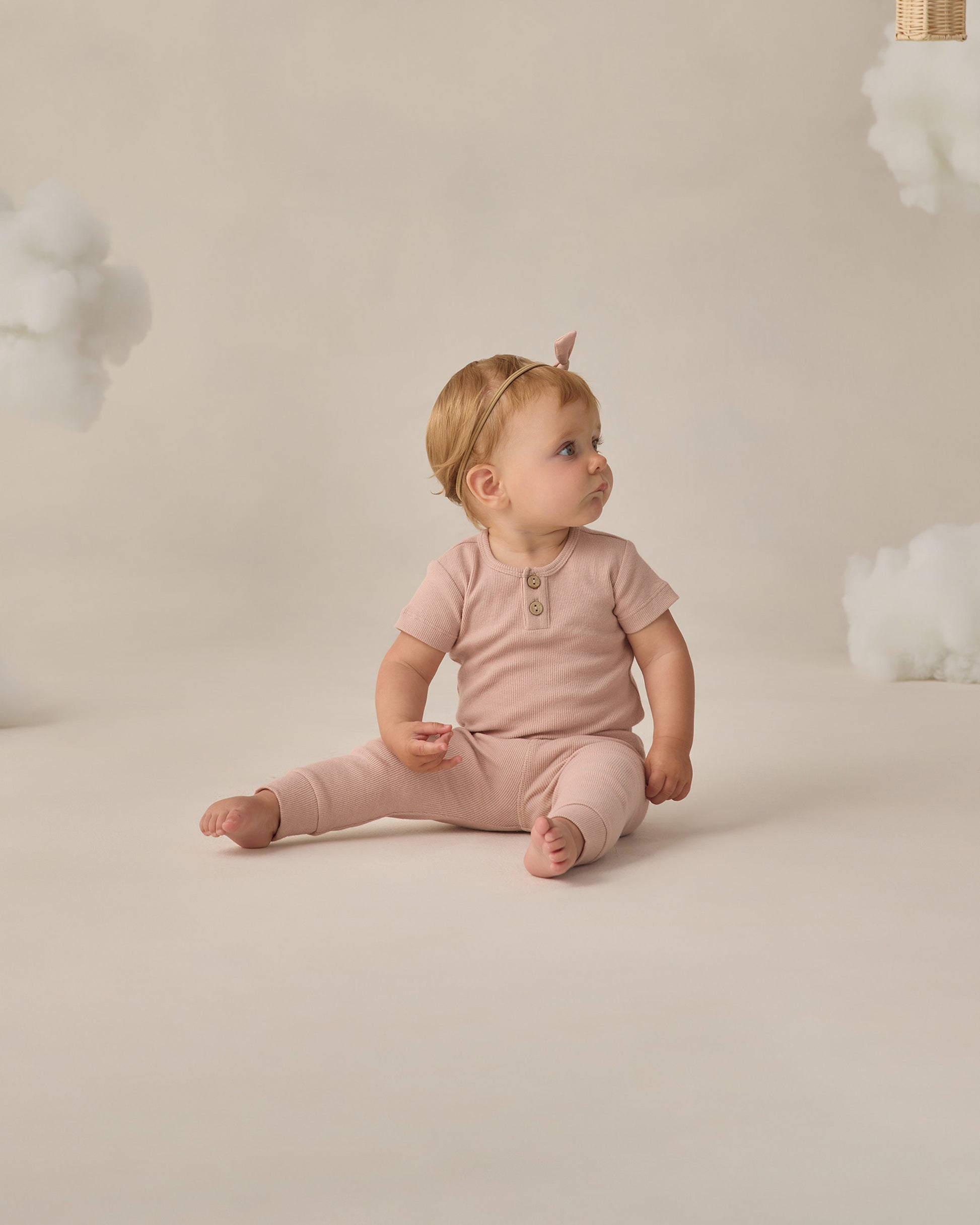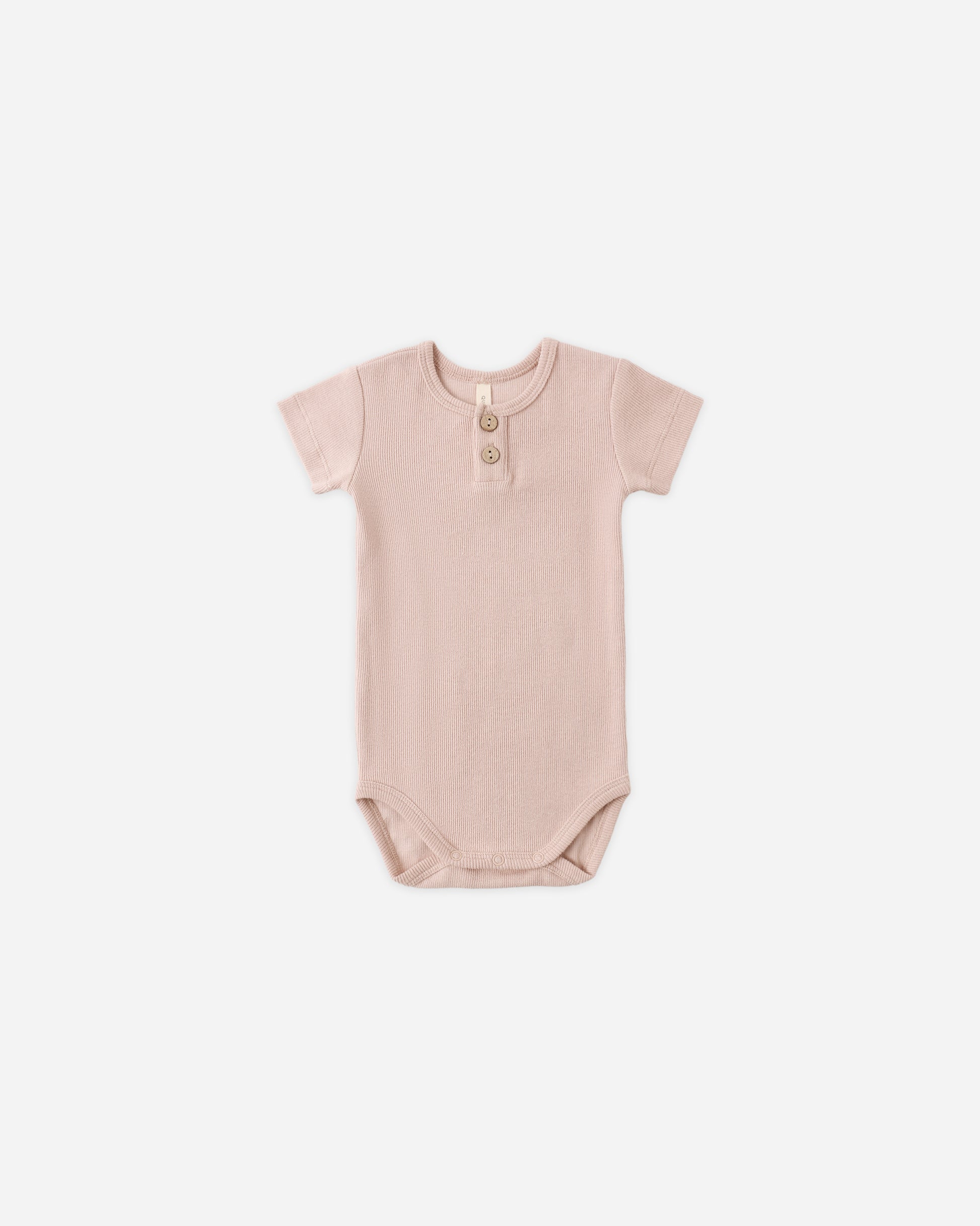 Our Ribbed Henley Bodysuit is designed with short sleeves, two-button front placket and bottom snaps for easy changes.