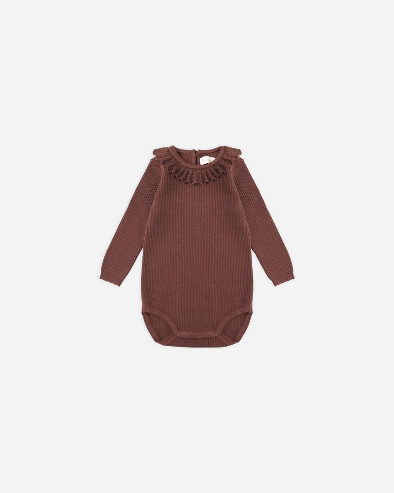 An essential for your little one, this darling knit bodysuit features a sweet ruffle collar, back keyhole button closure, and bottom snaps for effortless changes. Perfect for layering all season long.