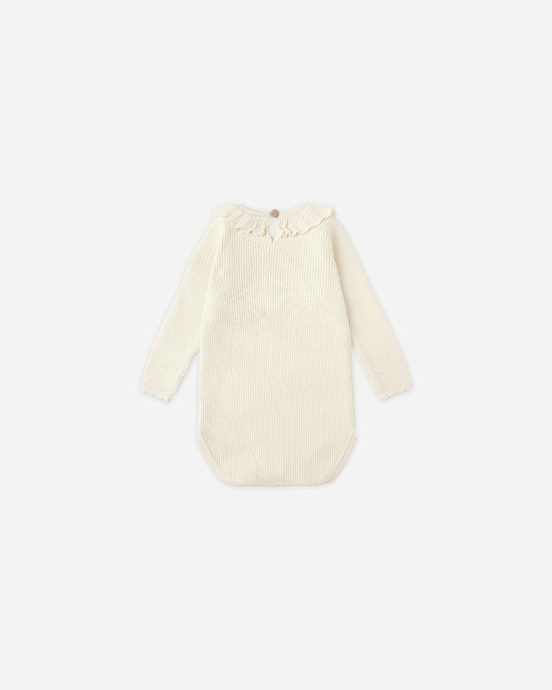 An essential for your little one, this darling knit bodysuit features a sweet ruffle collar, back keyhole button closure, and bottom snaps for effortless changes. Perfect for layering all season long.