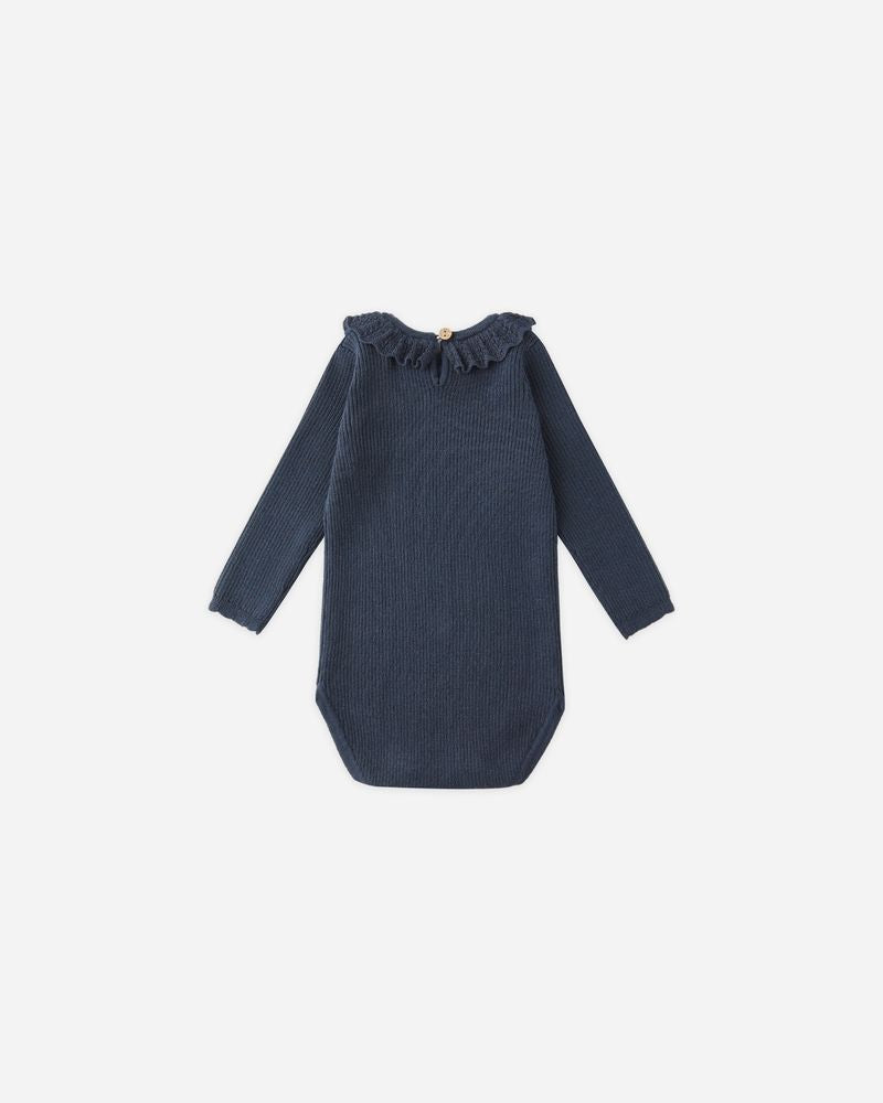 An essential for your little one, this darling knit bodysuit features a sweet ruffle collar, back keyhole button closure, and bottom snaps for effortless changes. Perfect for layering all season long.