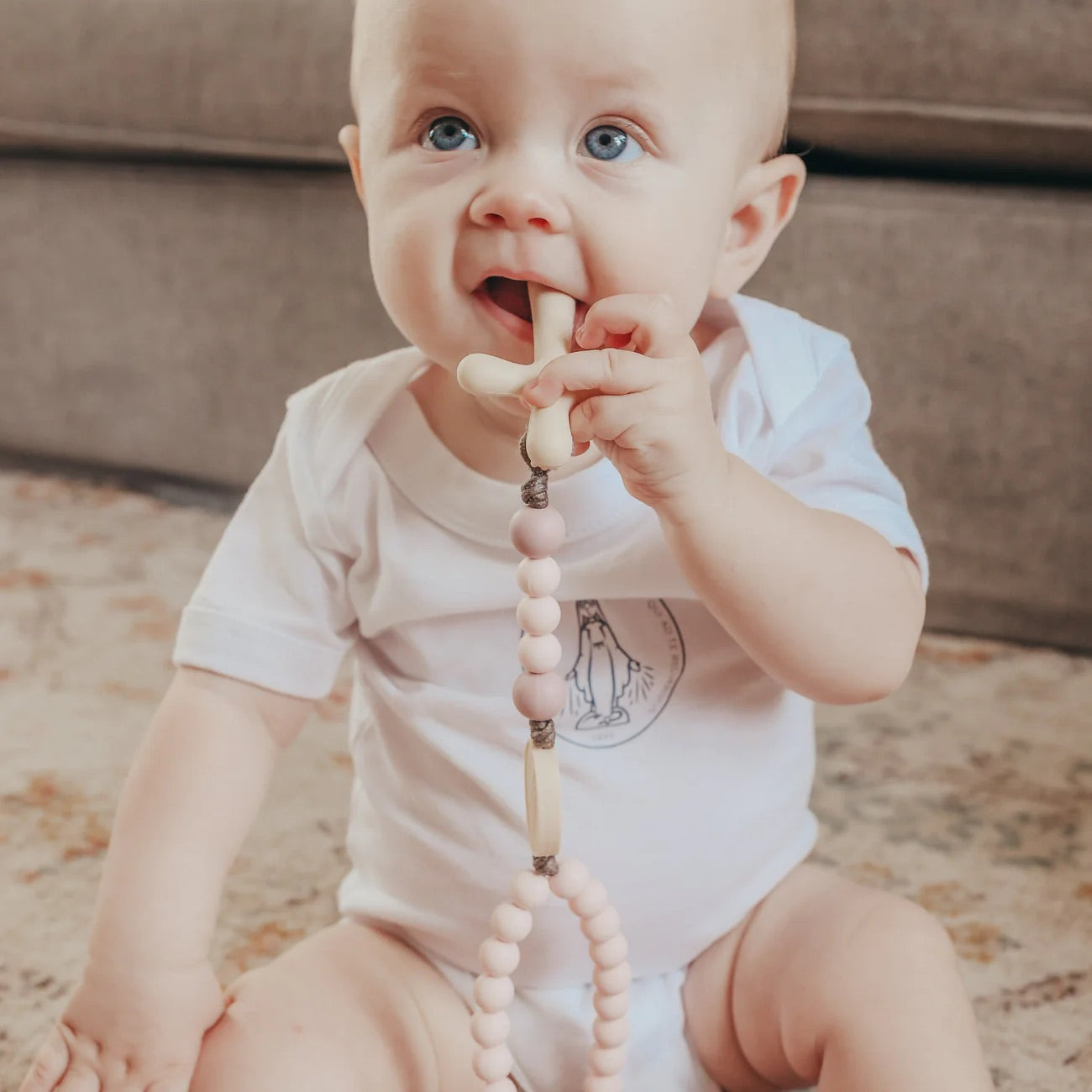 This beautiful silicone rosary is sure to bring joy to your home. This multicolored teething toy is not only soothing for your little one but it is also sure to help build wonder and love for the rosary. Watching your child hold this Silicone Rosary is like watching them hold the hand of Mary.