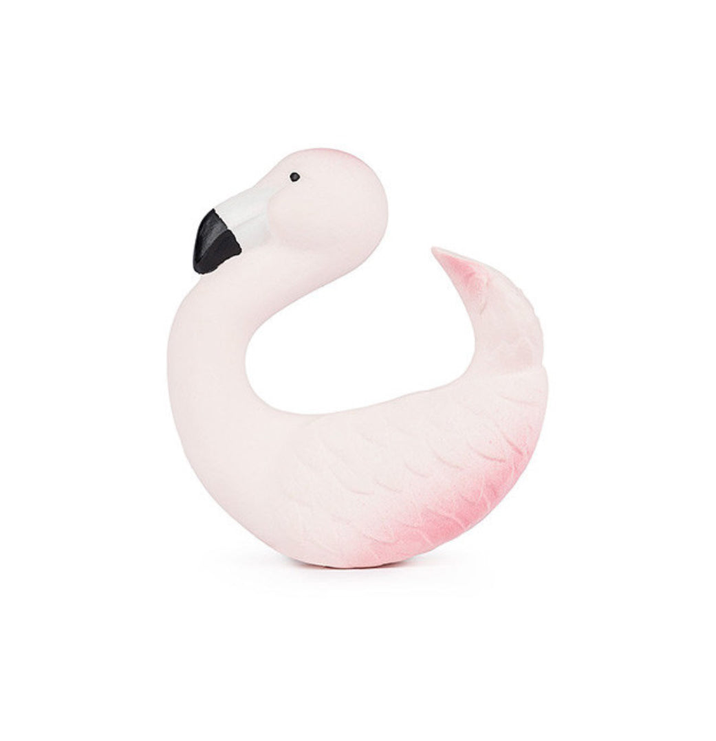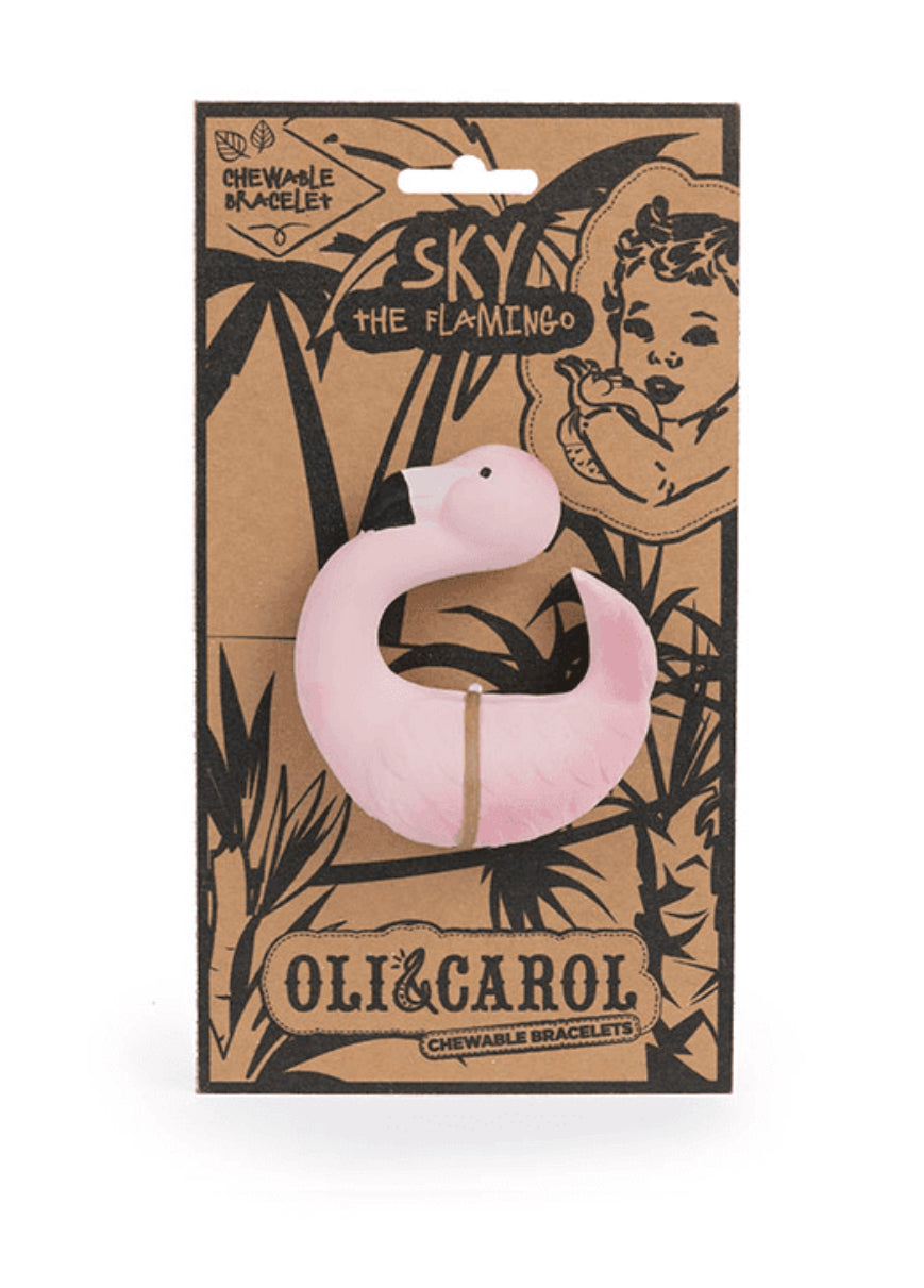Sky the Flamingo has traveled from the crystal clear water tropical island to play with babies and kids and to be their favorite teether, bath toy and sensory play toy. It is meant to be placed around babies’ wrists while chewing on it!