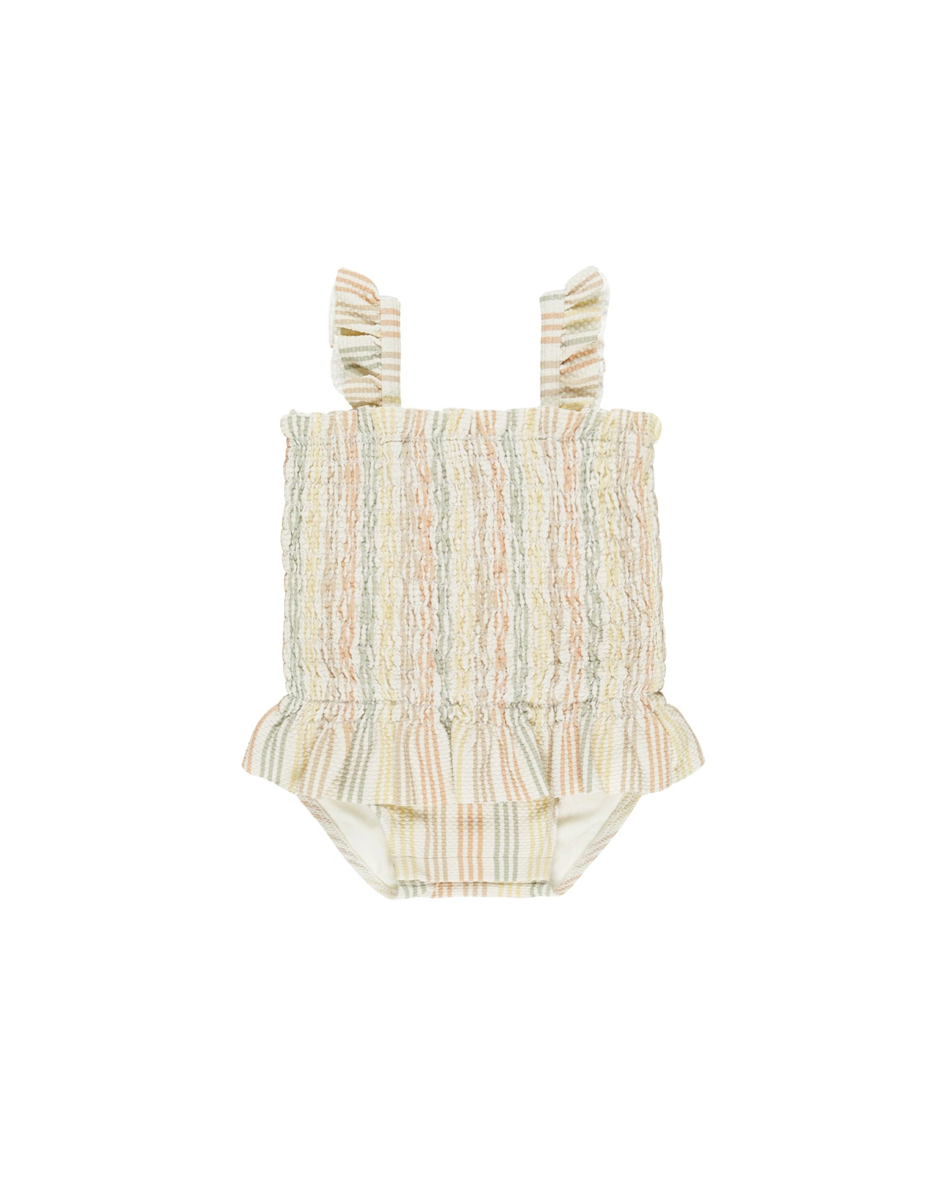 Our Smocked One-Piece Swimsuit features a sweet smocked bodice, ruffle sleeves, and ruffle peplum skirt.