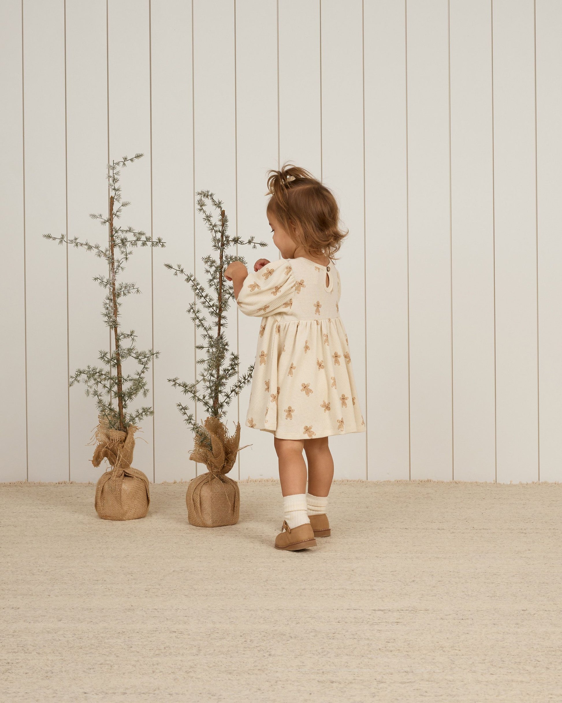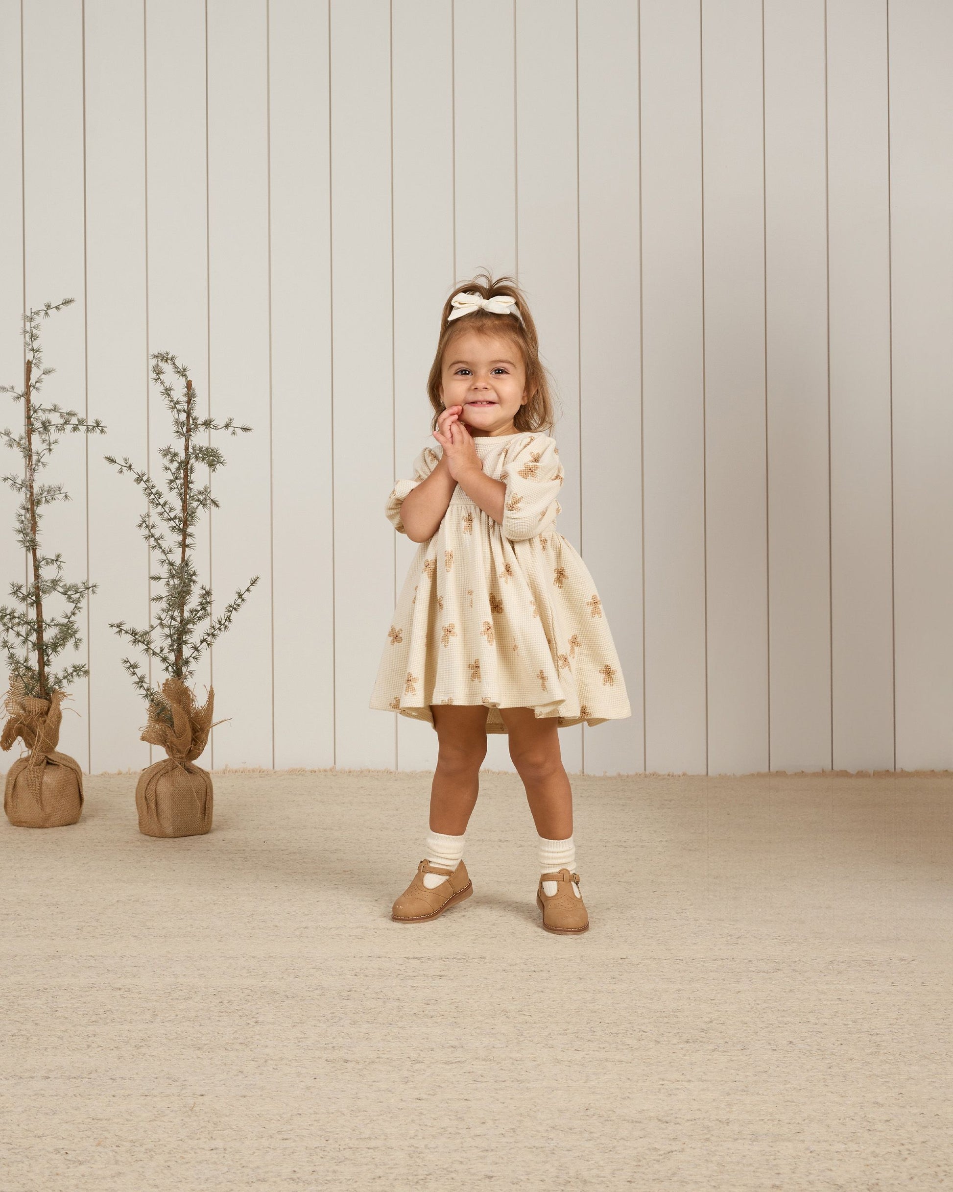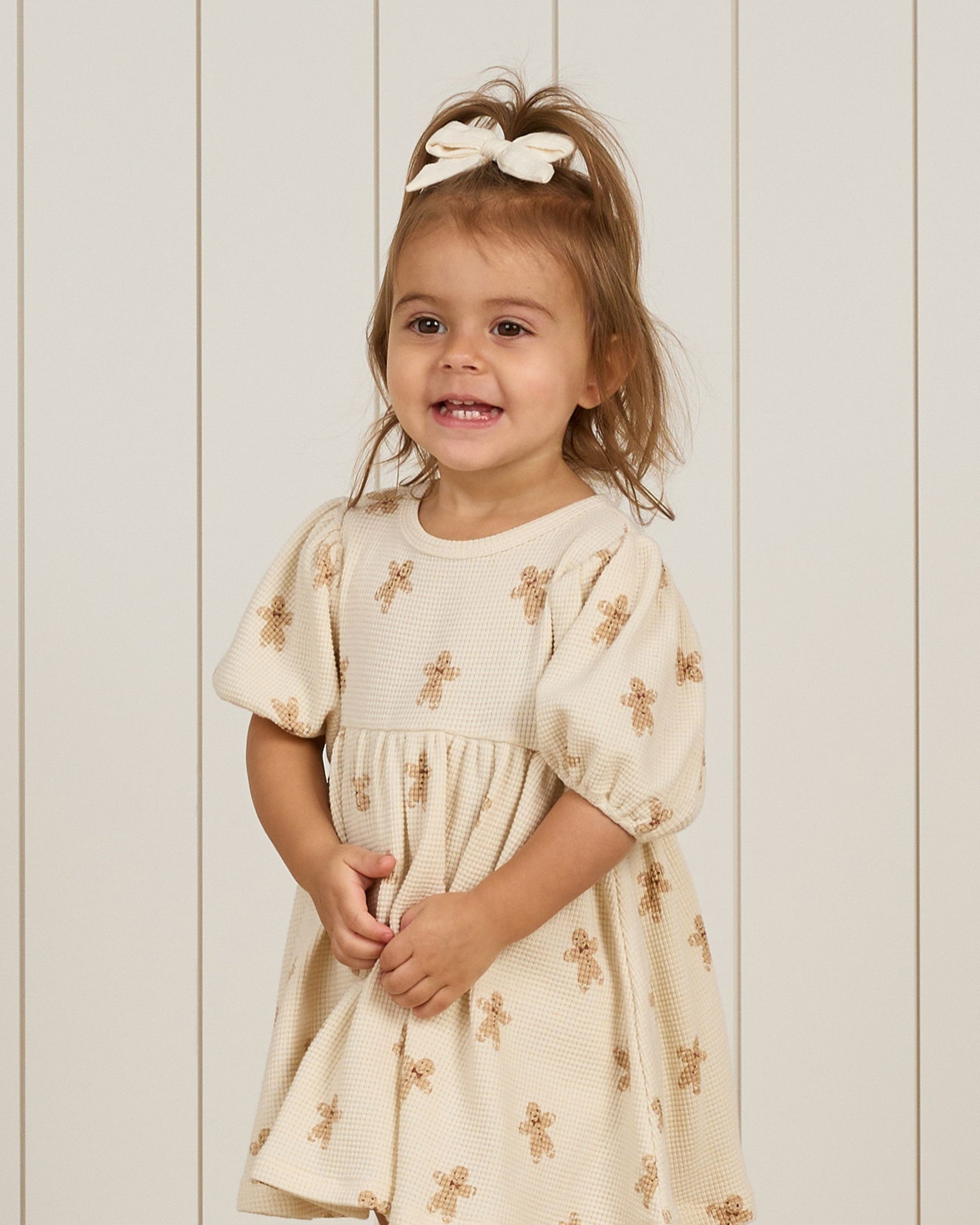 Our Babydoll Dress Set features an empire waist dress with balloon sleeves and a coconut button keyhole. It also includes matching baby bloomers.